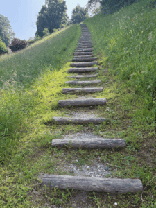 At one stage the trail was a steep set of steps and some small children were running down it. As had become typical, when I met children, everyone of then shouted “Hoi” and had a good look at me as they ran by. I reached the top quickly and then walked across a field and through some turnstiles. I passed several more children, with backpacks and hi-vis jackets. I thought it was lovely to see them all running home from school safely and clearly enjoying one another’s company.