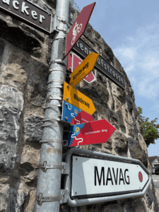 I continued walking downhill. I criss crossed each street so I wouldn’t miss seeing a sign. Eventually I found the distinctive red and blue “Liechtenstein Weg” sign on a small street. I almost kissed it (image 2 below) !