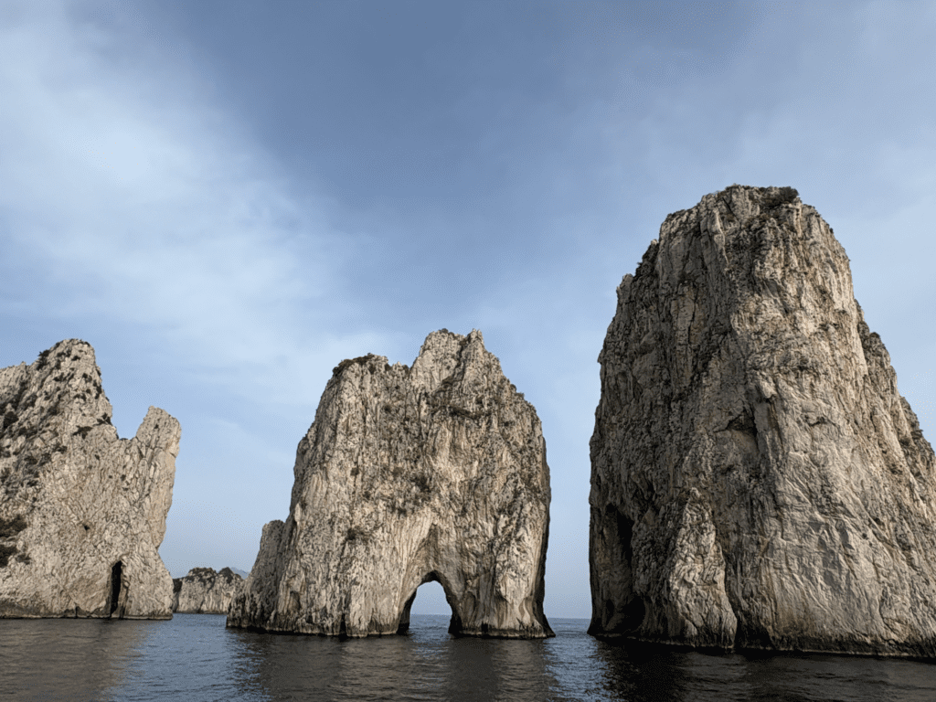 We then spent a wonderful hour going around the perimeter of Capri. It was great to see the amazing limestone cliffs and rock formations up close. The sea is a beautiful colour and very visibly blue close to the rocks. There were also some statutes and ruins in several areas.